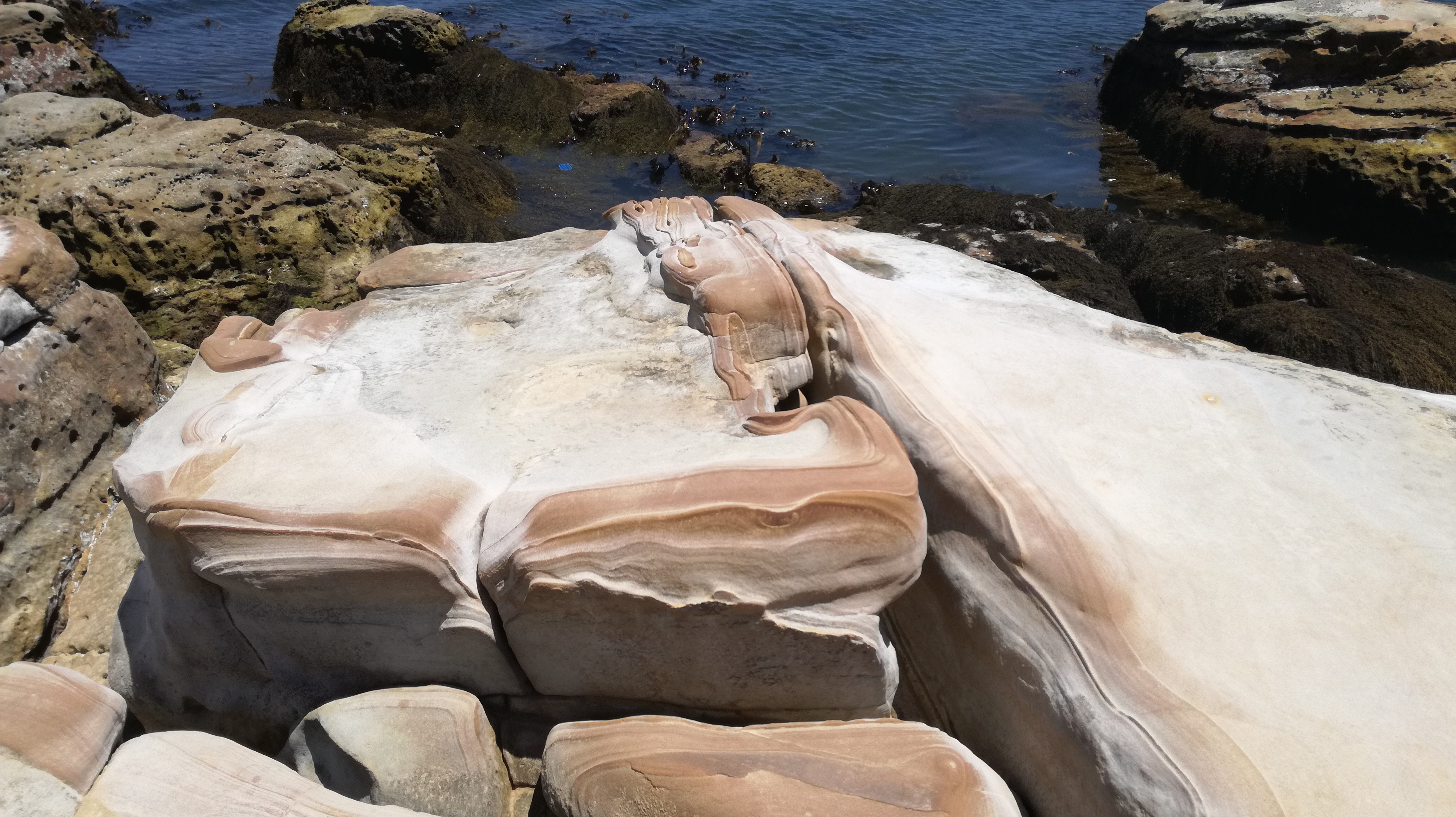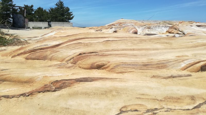 この「絵島」には小さな橋が架かっていて渡ることができます。渡ると目に飛び込んでくるのが不思議なもようの岩肌!