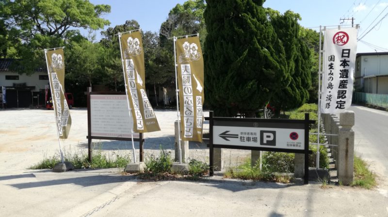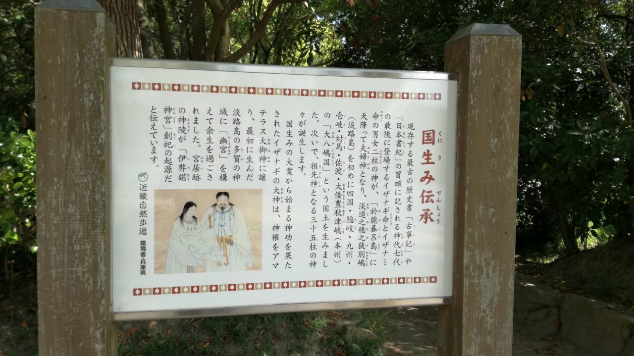 駐車場から小道を通り大鳥居へ出る手前に「国生み伝承」と伊弉諾神宮の簡単な起源が書かれています。
