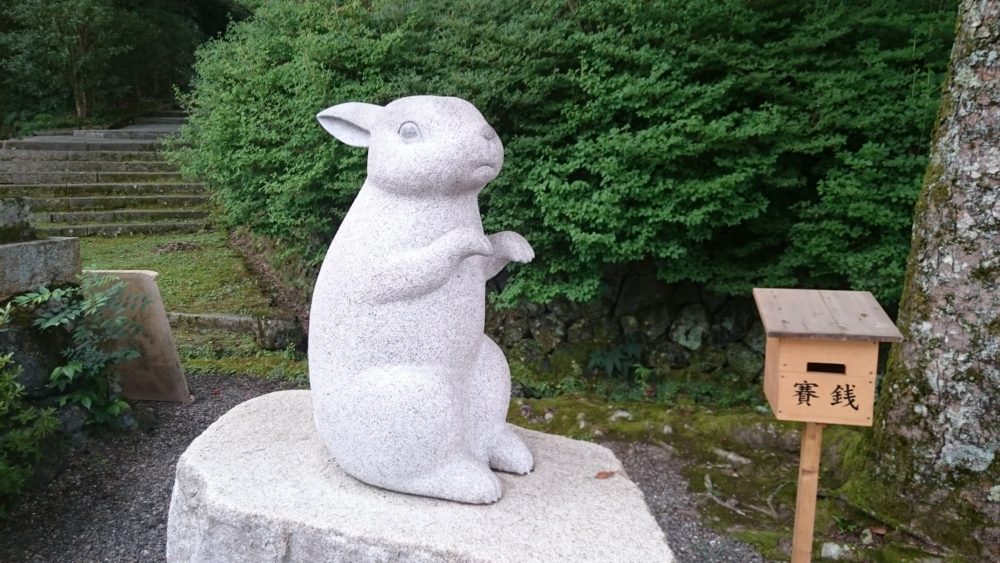 せんべいやさんに挨拶を済ませ、参道を進むと「なでうさぎ」さんが出迎えてくれます!昔は無かったような気もしますが、大国主命の神話に